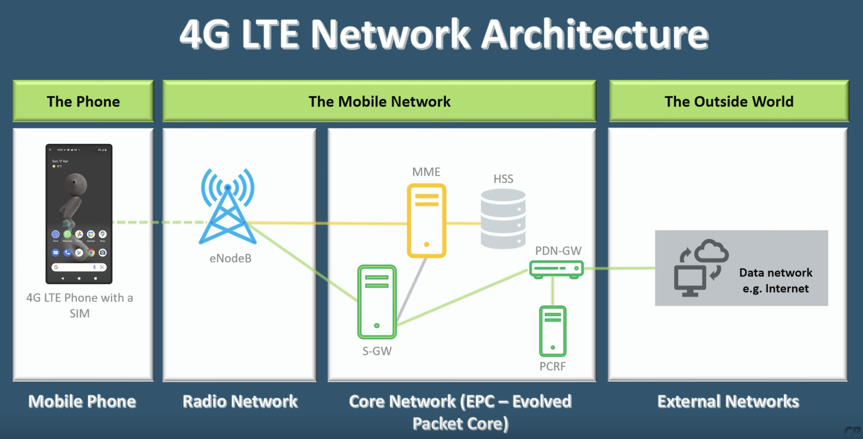 The LTE (Long Term Evolution) network architecture is divided into two main parts: the E-UTRAN (Evolved Universal Terrestrial Radio Access Network) and the EPC (Evolved Packet Core). Together, they form the foundation for high-speed wireless communication. Below is a description of each component and its features.