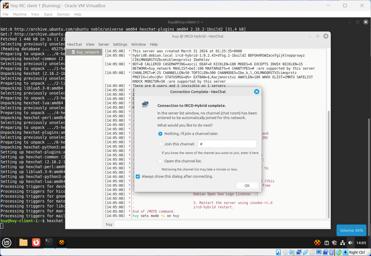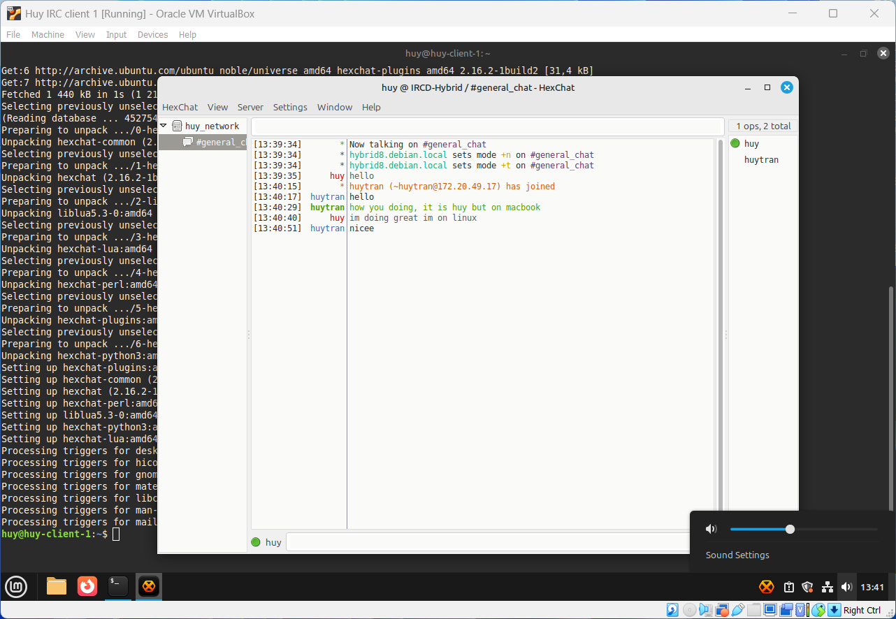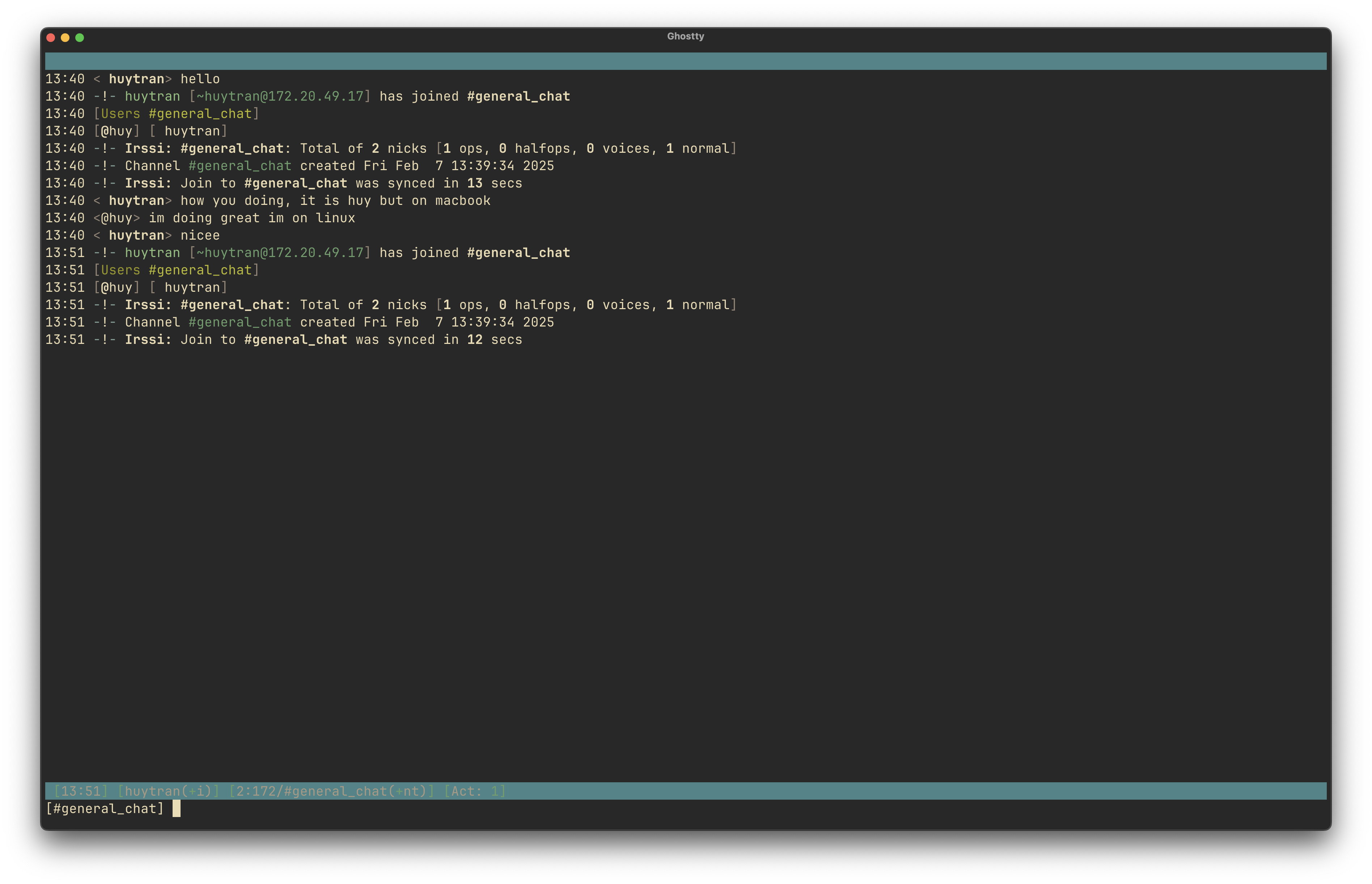 With everything ready, I will start connecting from clients to server and join the chat at #general_chat. My Linux Mint nickname is huy and my MacBook nickname is huy-macbook.