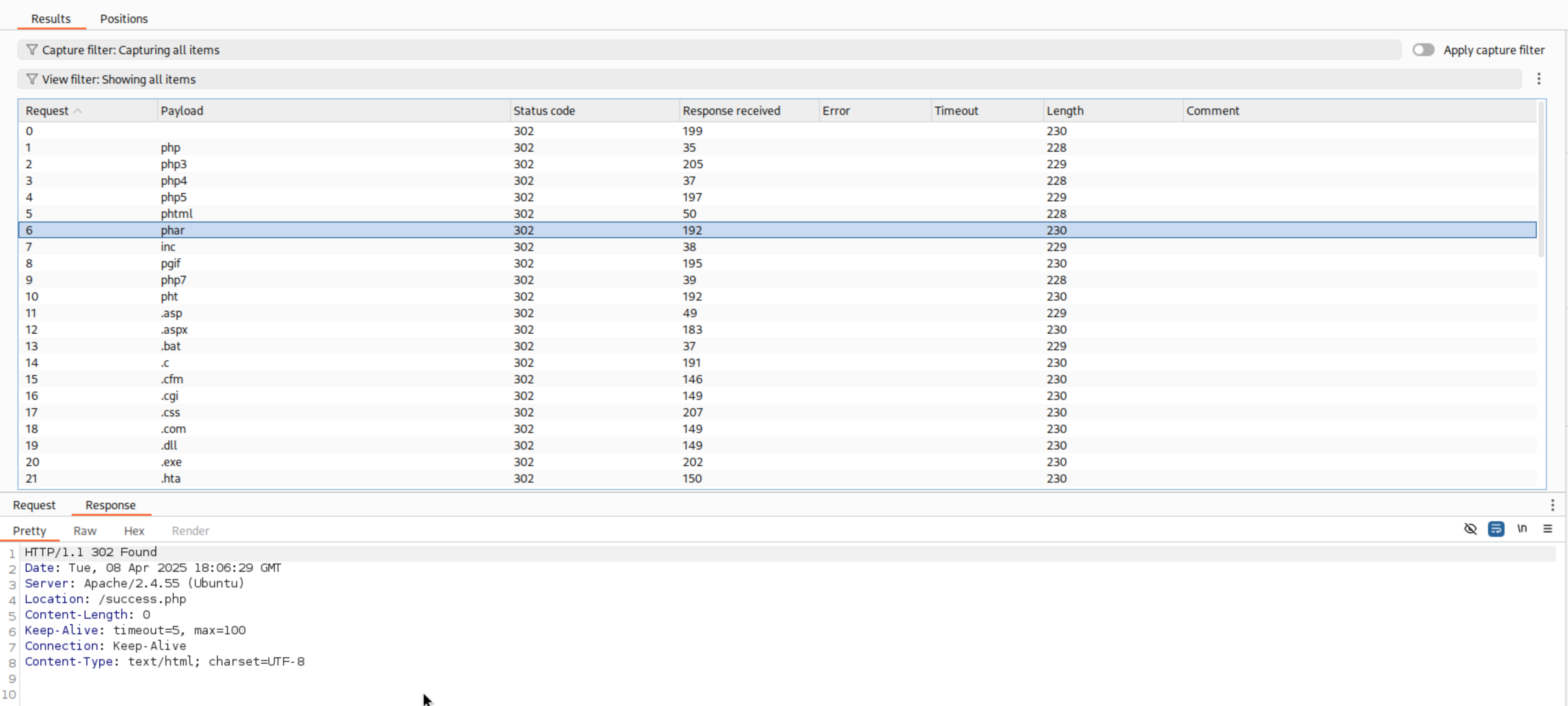 The results are different depending on the web application. You may see a 200 OK response, which means that the file was uploaded successfully. The Response Received or Length might stand out as well. However, in my case, the successful upload was indicated within the Response Body. The web application returned the location of Location: /success.php.