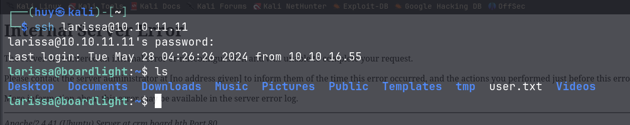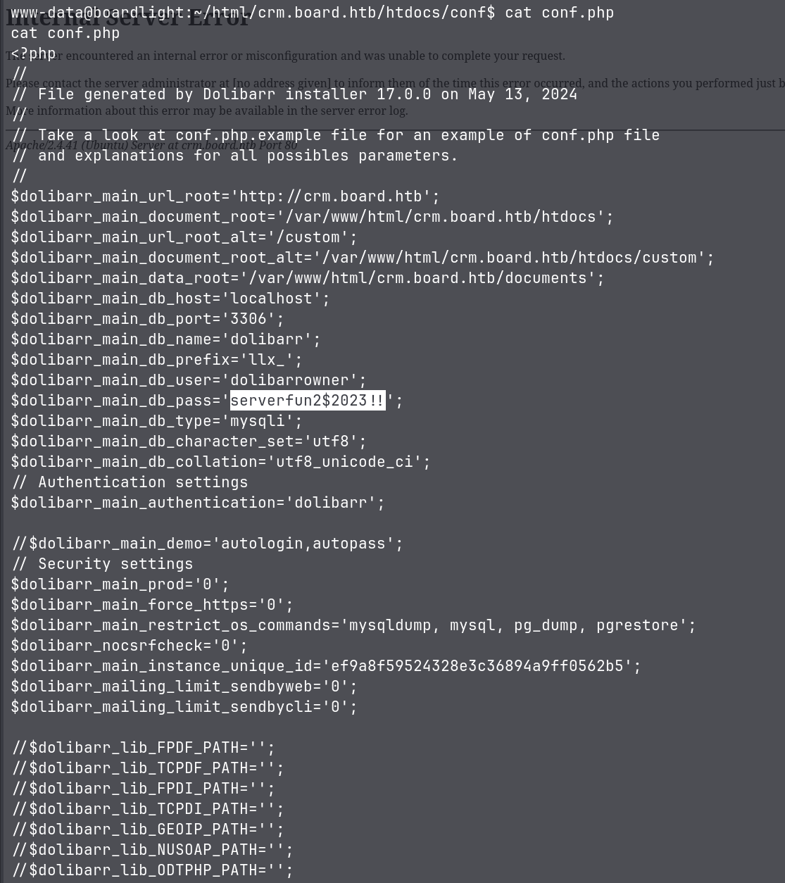 But I was not able to get the user flag with this shell. I decided to search and find a way to SSH into the machine. After searching around, I found conf directory which contained conf.php file. In this file, I found plain password for the user larissa.