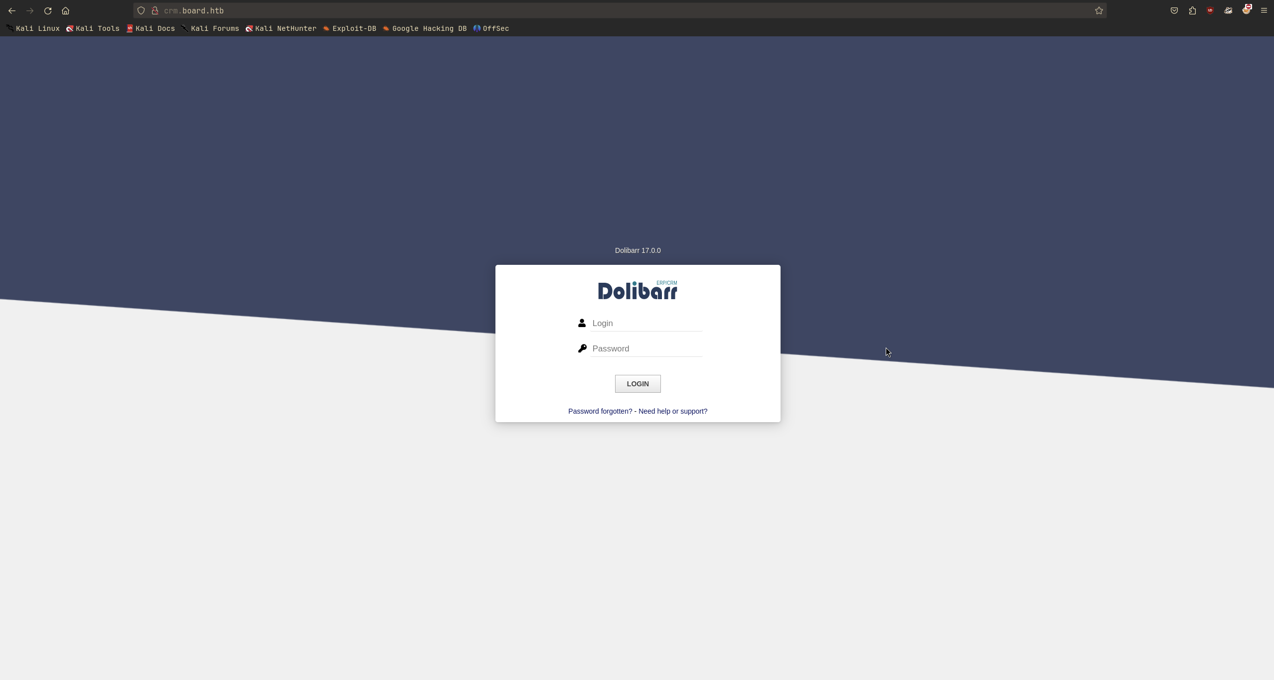 Gotcha! The ffuf tool found crm.board.htb. I added this to my /etc/hosts file and navigated to the URL.