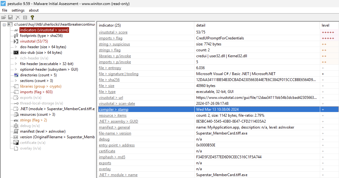 Therefore, it acts as a unique identifier for the file. We can get it by using the sha256sum command or by PEStudio.