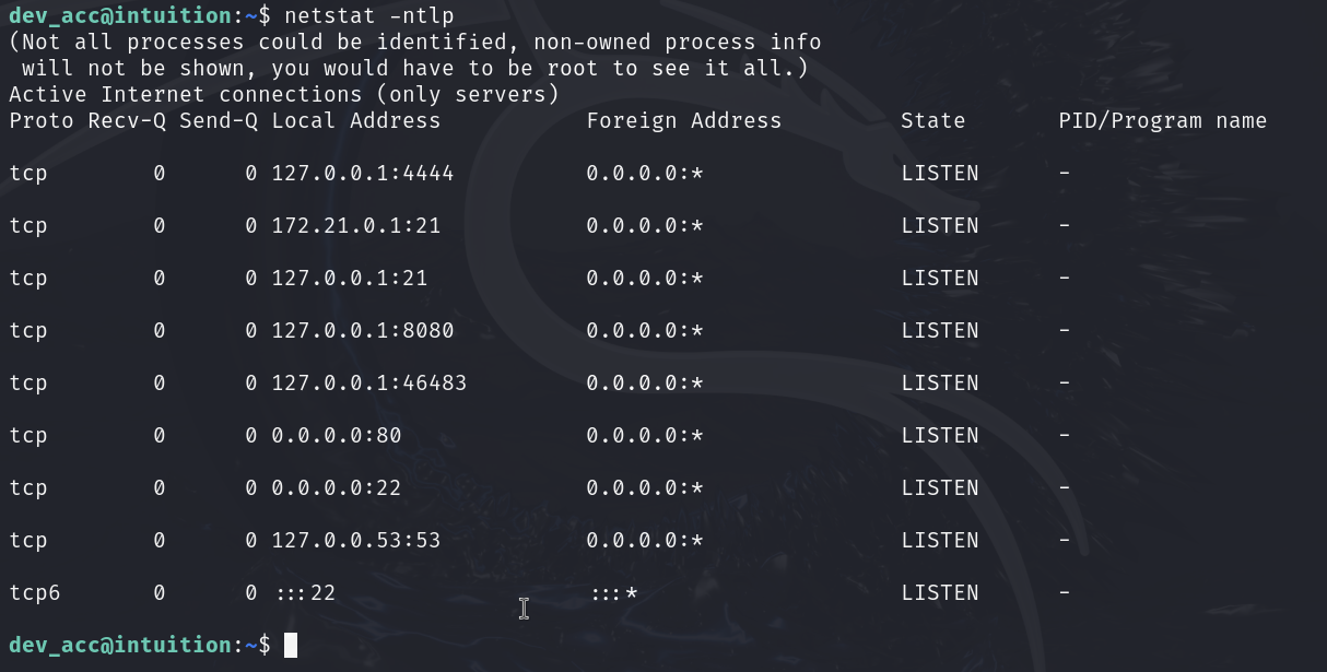 Next step is to escalate the privilege to root, first enumerate the machine by checking for ports with netstat.