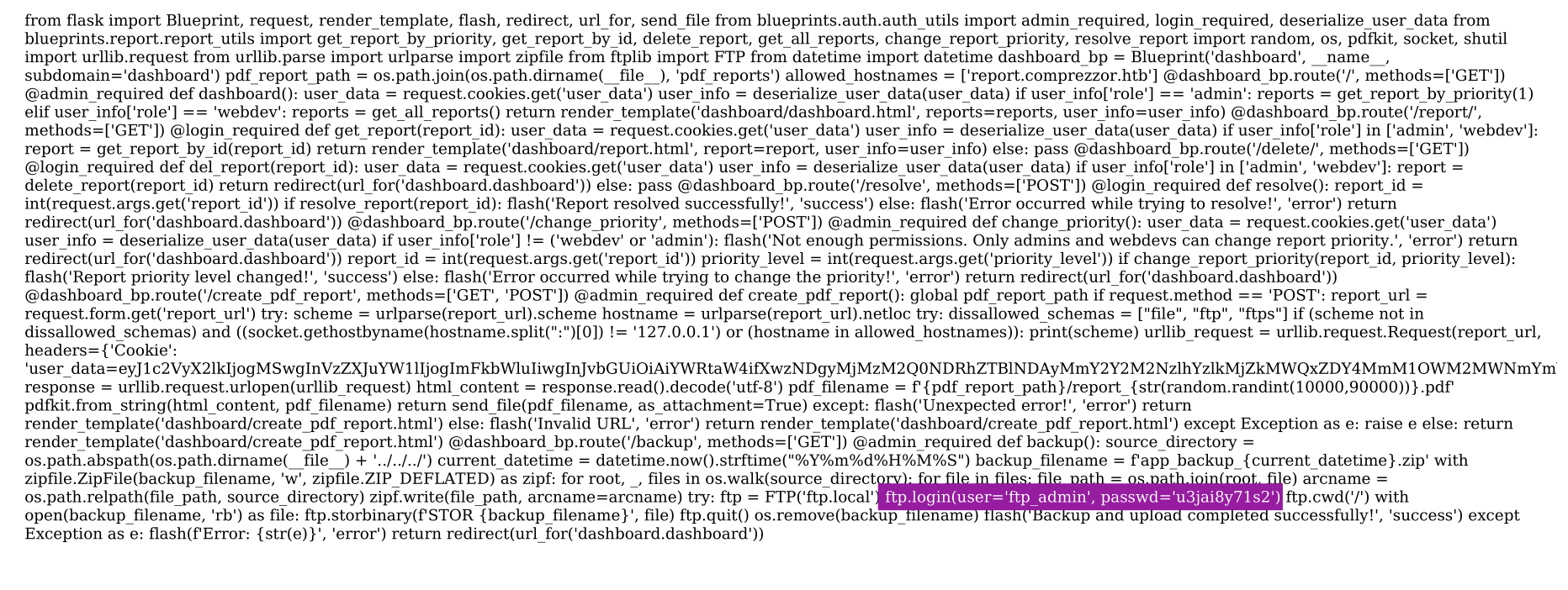 From the auth.py file, I can find the ftp credentials. with that being said, we can ftp access to the machine through the create report function.