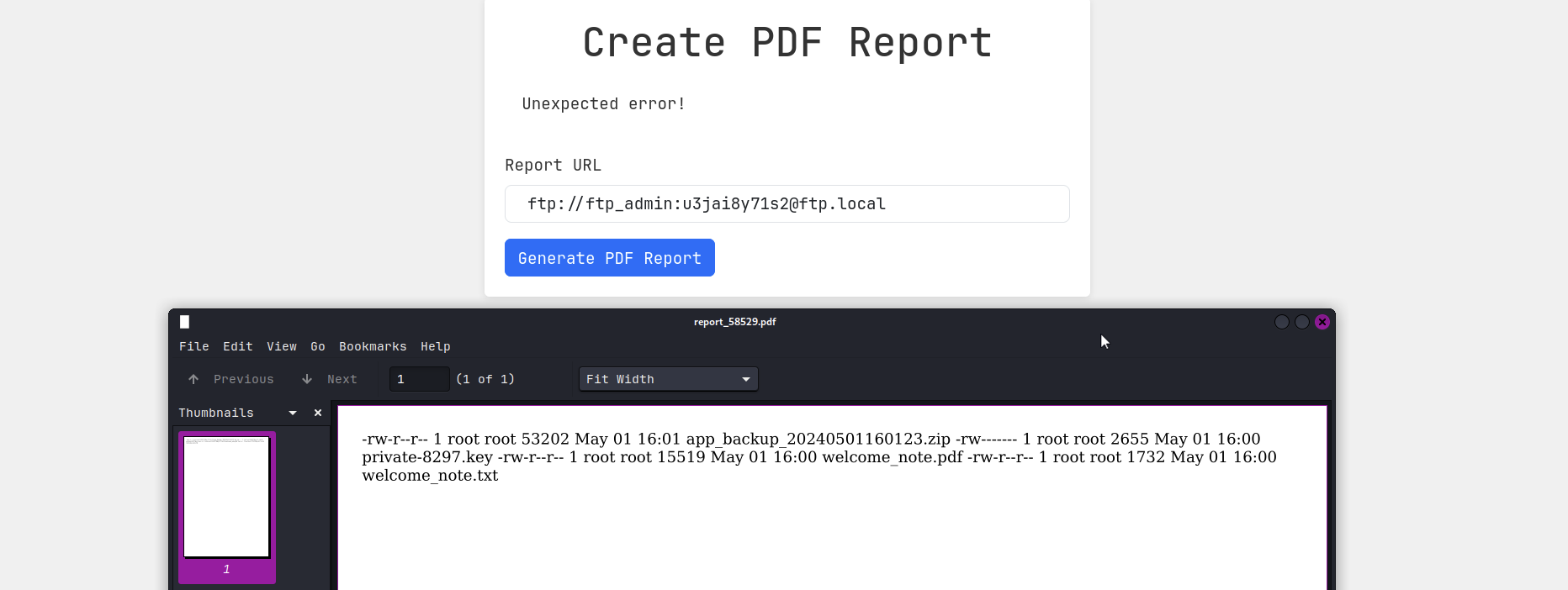 I did some enumeration and found that the wkhtmltopdf is installed on the machine. I tried to create a PDF report with the following payload. However, seems like we cannot proceed further with this method.