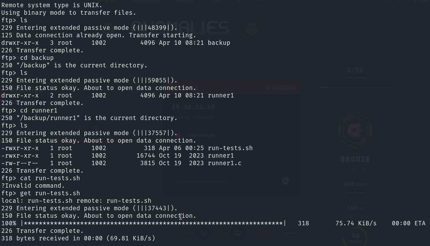 There is a directory backup with another directory runner1 which contains following files: run-tests.sh, runner1, and runner1.c. I use the get command to download them all.
